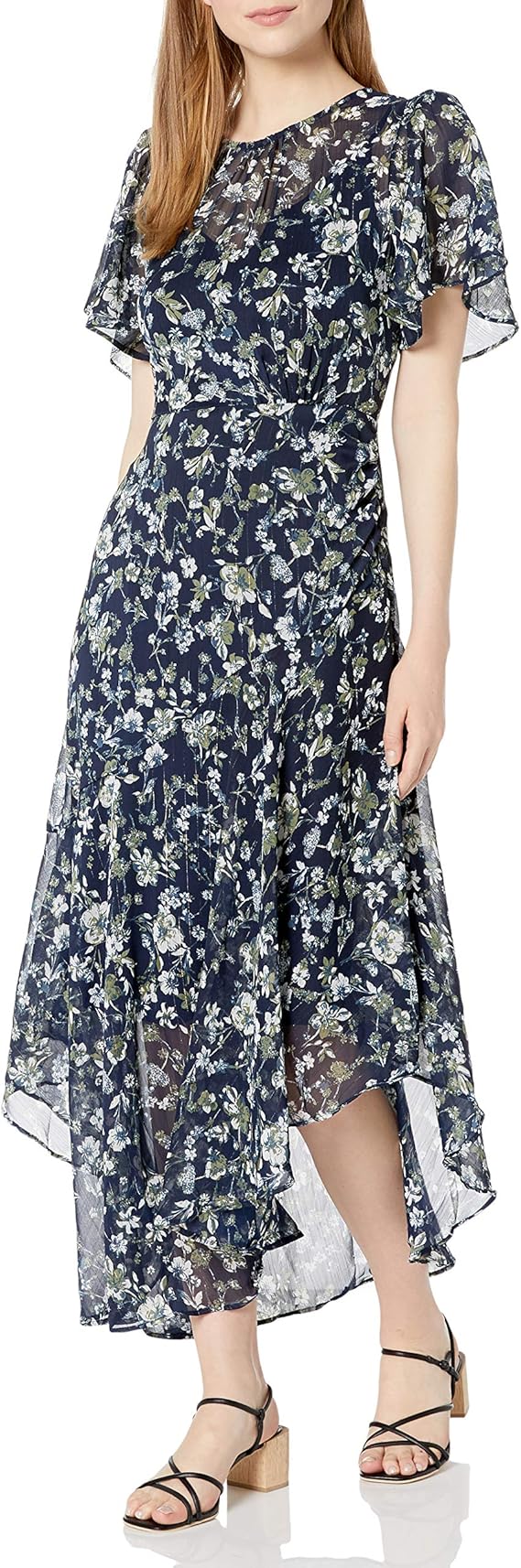 This stunning dress features a vibrant floral print and flutter sleeves that add a feminine touch. The dress is made from a lightweight, flowy fabric that is perfect for spring. Pair it with some strappy sandals and statement earrings for a complete look.